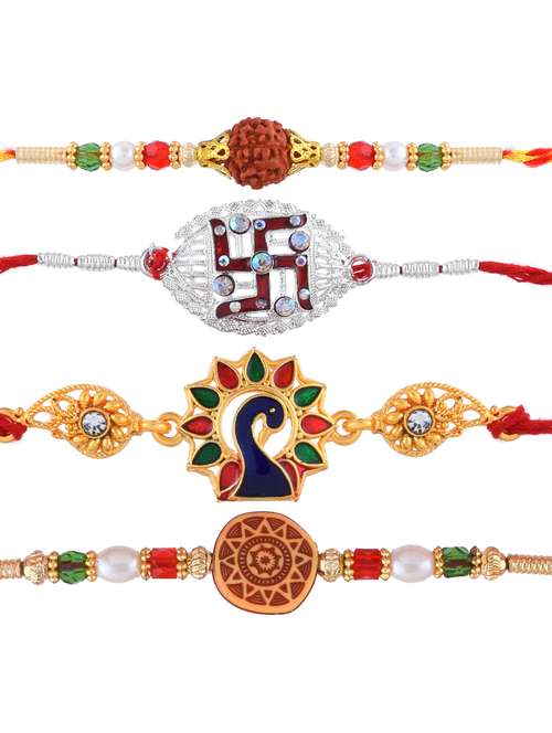 - » multi coloured 4 piece rakhi combo set for bhaiya bhabhi rakshabandhan (pack of 4)