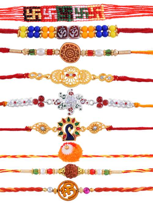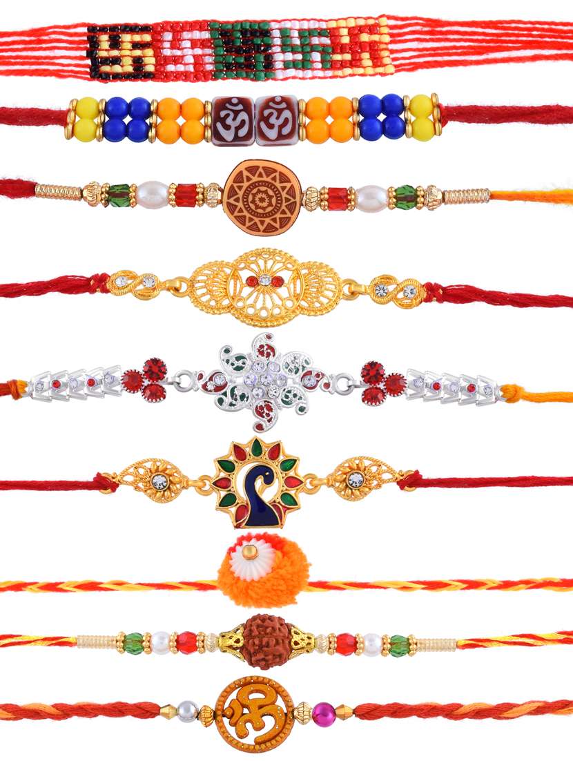 silver & gold plated 9 piece rakshabandhan rakhi combo for bhaiya and bhabhi (pack of 9)
