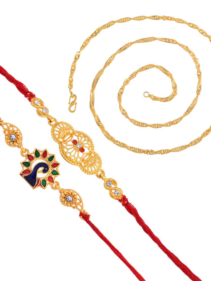 3 rakhi set rakshabandhan combo for bhai bhabhi with gold-plated brass chain (pack of 3)