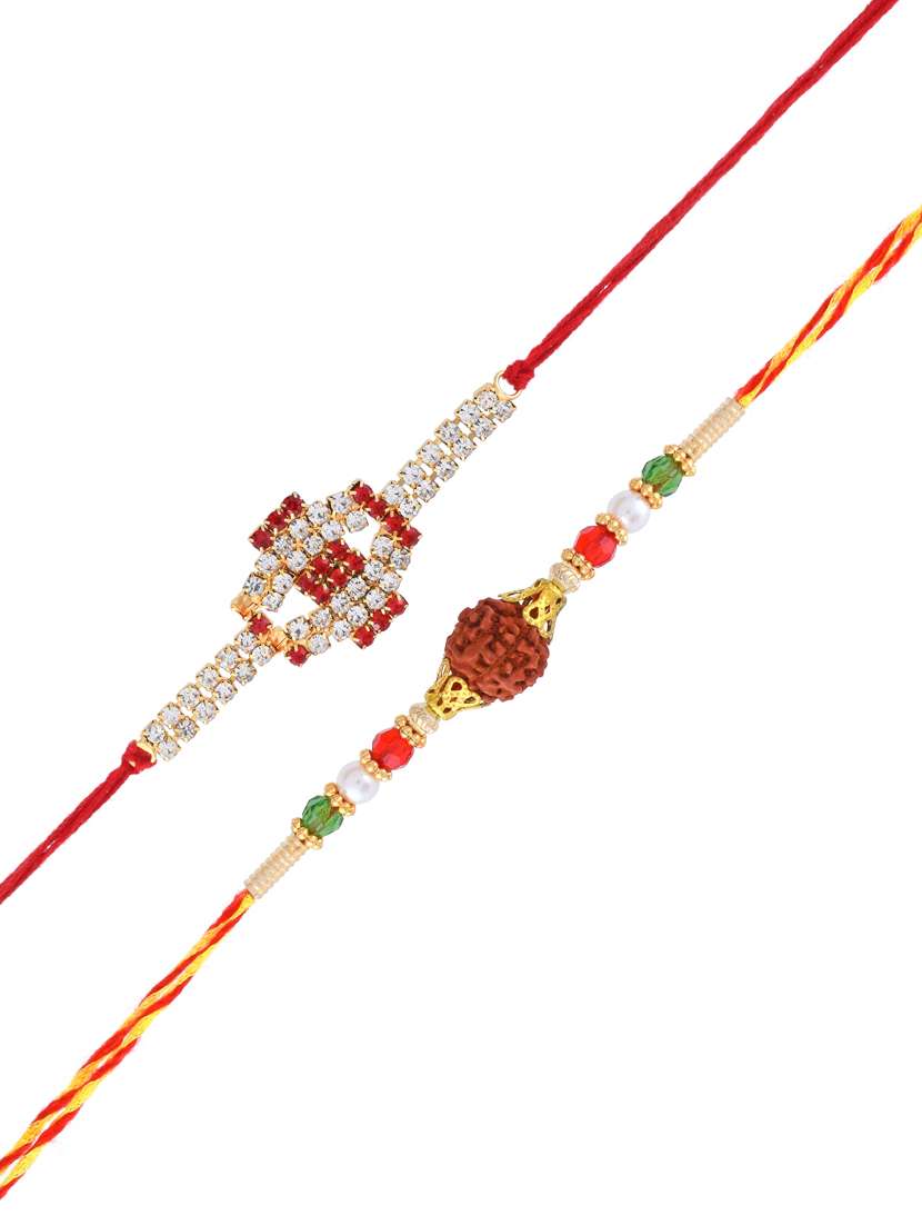 2 Different designs of Rakhi set for members of family. One Goldplated COlourful CZ studded Rakhi for Bhai and One Real and Genuine Energised Rudrkash Rakhi for Bhabhi. An excellent rich looking stylish Rakhi set to make your festival celebration and enjoyment, rich and memorable. Also called Raksha-Sutra's these simple elegant threads are a wonderful way, to celebrate the love and bond between Brothers and sisters. A unqiue festival unique only to Indians, the festival is celebrated among all castes and creed. What a better way to celebrate this Rakhi festival with latest and trendy, Rakhi combo, whbich comb ines fashion with tradition. Coming in branded gift box,with a surprise gift included. Memoir jewellery brand assurance of best materials and components. A rich looking latest trendy Fashion Rakhi set combo, it adds charm and grace to your enjoyment. A combo, which besides Rakhi, can also be used for Hindu Puja,ceremonies, Bhai Dooj, Festivals, mariages, Yagna, and any Hindu ritual or festival. Similiar yet a bit different look will give speical attraction to the gathering with these stylish Rakhi Bracelet wrist threads. Comes with complimentry Roli Chawal pouch pack, in Memoir branded gift packing.