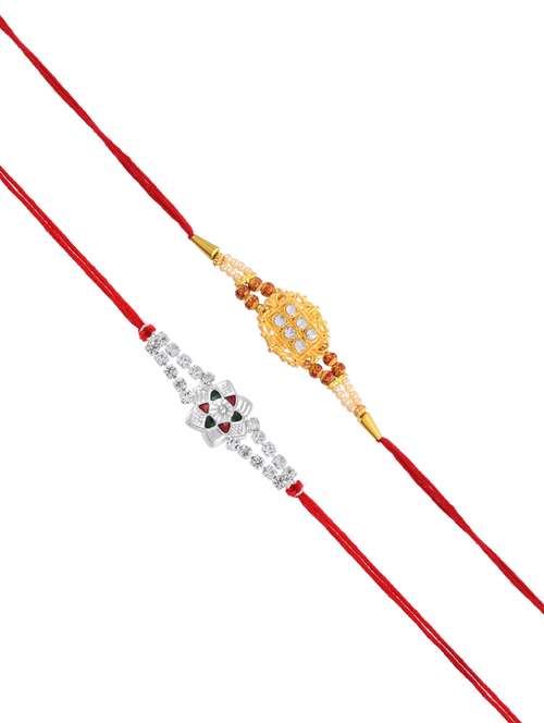 2 Different designs of Rakhi set for members of family. One Pure Silver Goldplated Imitation Diamond studded Stylish Rakhi for Bhai. One flowershaped CZ studded real silver Rakhi for Bhabhi.Also called Raksha-Sutra's these simple elegant threads are a wonderful way, to celebrate the love and bond between Brothers and sisters. A unqiue festival unique only to Indians, the festival is celebrated among all castes and creed. What a better way to celebrate this Rakhi festival with latest and trendy, Rakhi combo, whbich comb ines fashion with tradition. Coming in branded gift box,with a surprise gift included. Memoir jewellery brand assurance of best materials and components. A rich looking latest trendy Fashion Rakhi set combo, it adds charm and grace to your enjoyment. A combo, which besides Rakhi, can also be used for Hindu Puja,ceremonies, Bhai Dooj, Festivals, mariages, Yagna, and any Hindu ritual or festival. Similiar yet a bit different look will give speical attraction to the gathering with these stylish Rakhi Bracelet wrist threads. Comes with complimentry Roli Chawal pouch pack, in Memoir branded gift packing.