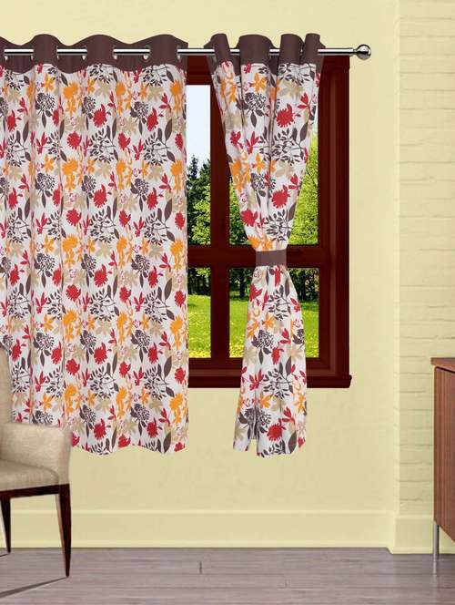 lushomes leaf printed cotton curtains with 8 eyelets & plain tiebacks for windows (single pc)