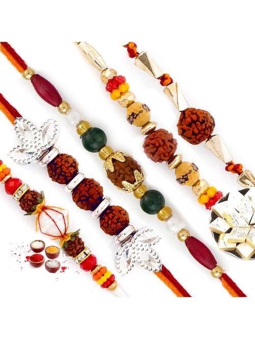 - » golden and silver beads rudraksh rakhi (set of 5)