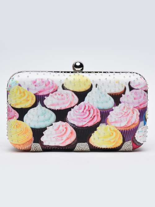 multicoloured cupcakes printed box clutch