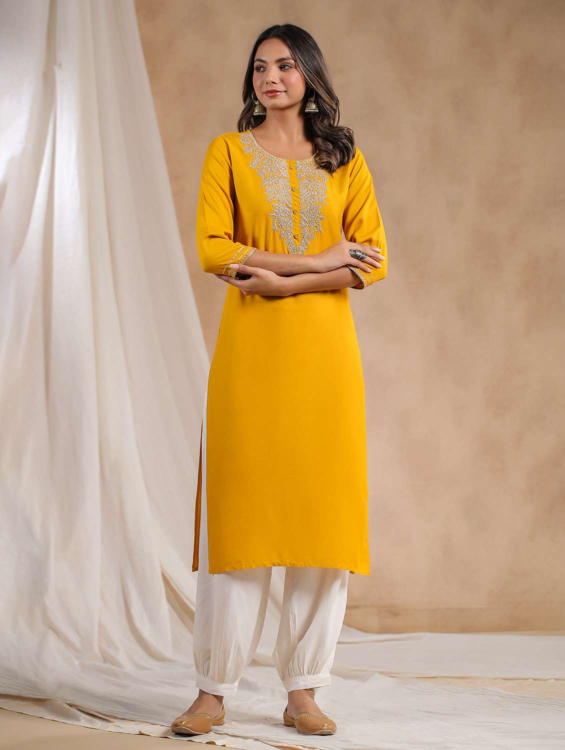- » women mustard round neck straight kurta