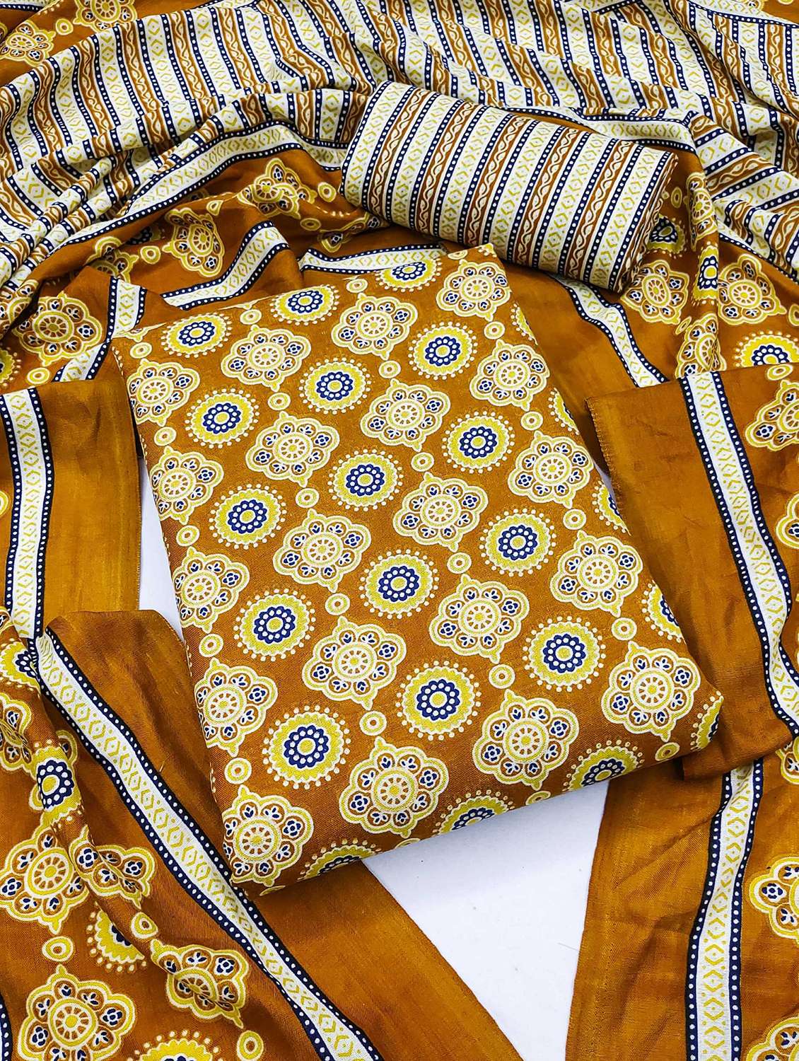 - Look ultra gorgeous in unstitched suits from Leeli Peeri Designer and grab these beautiful suits in mustard colour.