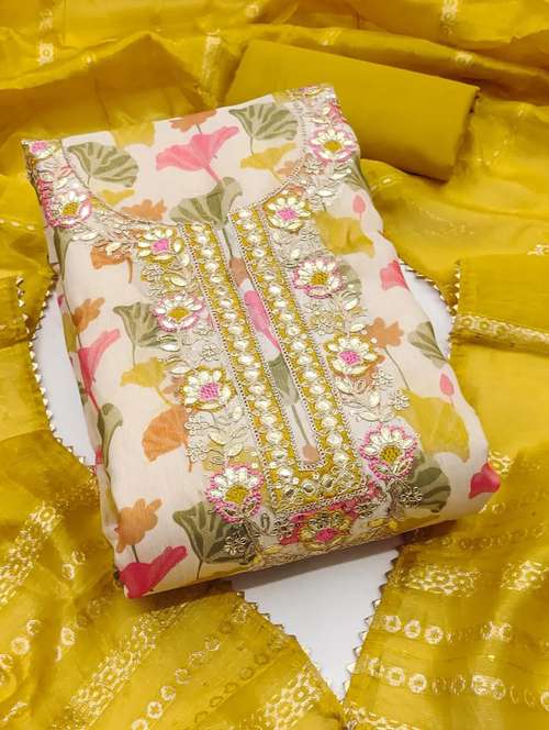- Look ultra gorgeous in unstitched suits from Leeli Peeri Designer and grab these beautiful suits in mustard colour.
