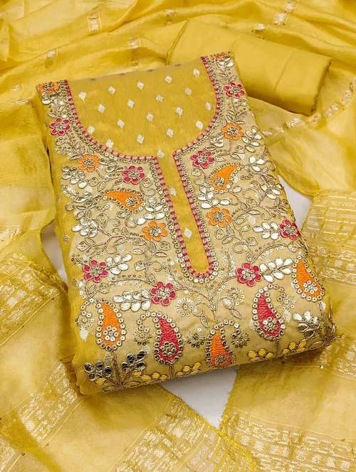 - Look ultra gorgeous in unstitched suits from Leeli Peeri Designer and grab these beautiful suits in mustard colour.