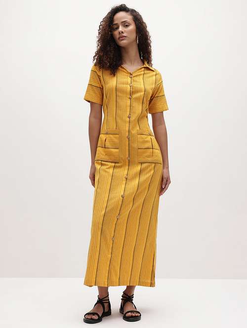 Mustard and Black striped shirt dress with a shirt collar, short regular sleeves, button closure, and a maxi length with a flared hem. Includes a belted detail at the waist. Cotton fabric.