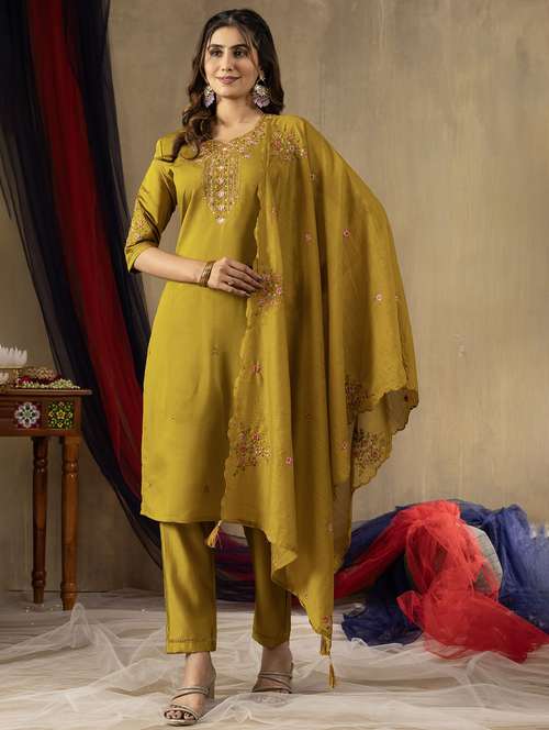 - Find gorgeous sets of ethnic wears in trending designs in mustard colors suitable for festive wear of occasions.