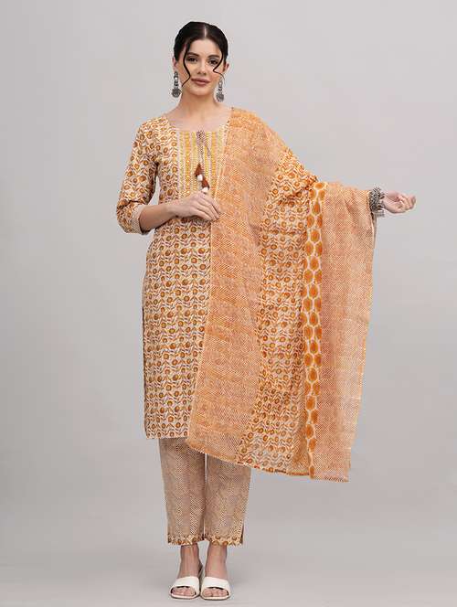 women mustard tie up neck kurta pant set with dupatta