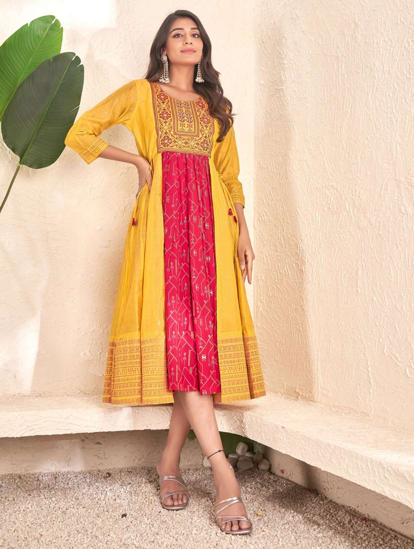 women yellow & pink round neck ethnic dress