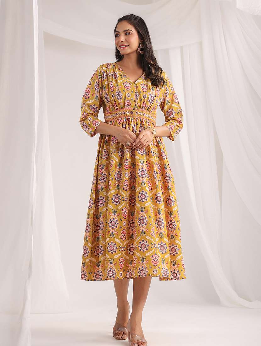 Elevate your wardrobe with Janasya's Cotton Dress, a striking fusion of comfort and style. Embrace the allure of ethnic motif prints in vibrant mustard, perfect for making a statement. The gathered design adds a touch of elegance, while the V-neckline exudes sophistication. Complete with button and loop closure, this dress is a testament to timeless charm and contemporary flair.