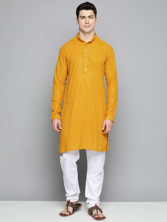 Mustard Embroidered Kurta with Pyjamas, Mustard straight knee length kurta, has a mandarin collar, long sleeves, straight hem, White solid pyjamas, drawstring closure