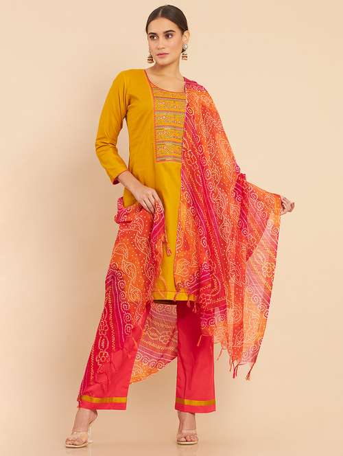 yellow coloured embroidered salwar unstitched suit