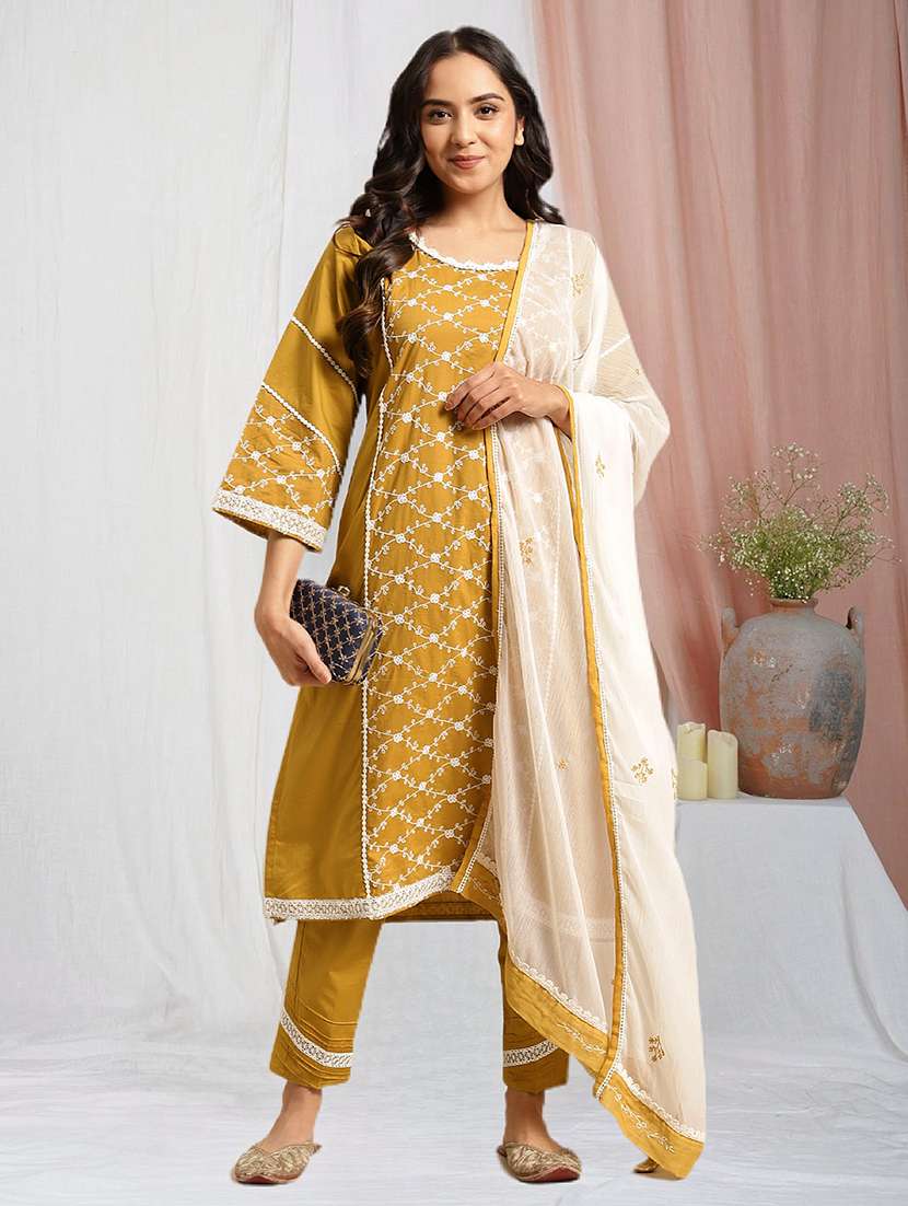 - Find gorgeous sets of ethnic wears in trending designs in mustard colors suitable for casual wear of occasions.