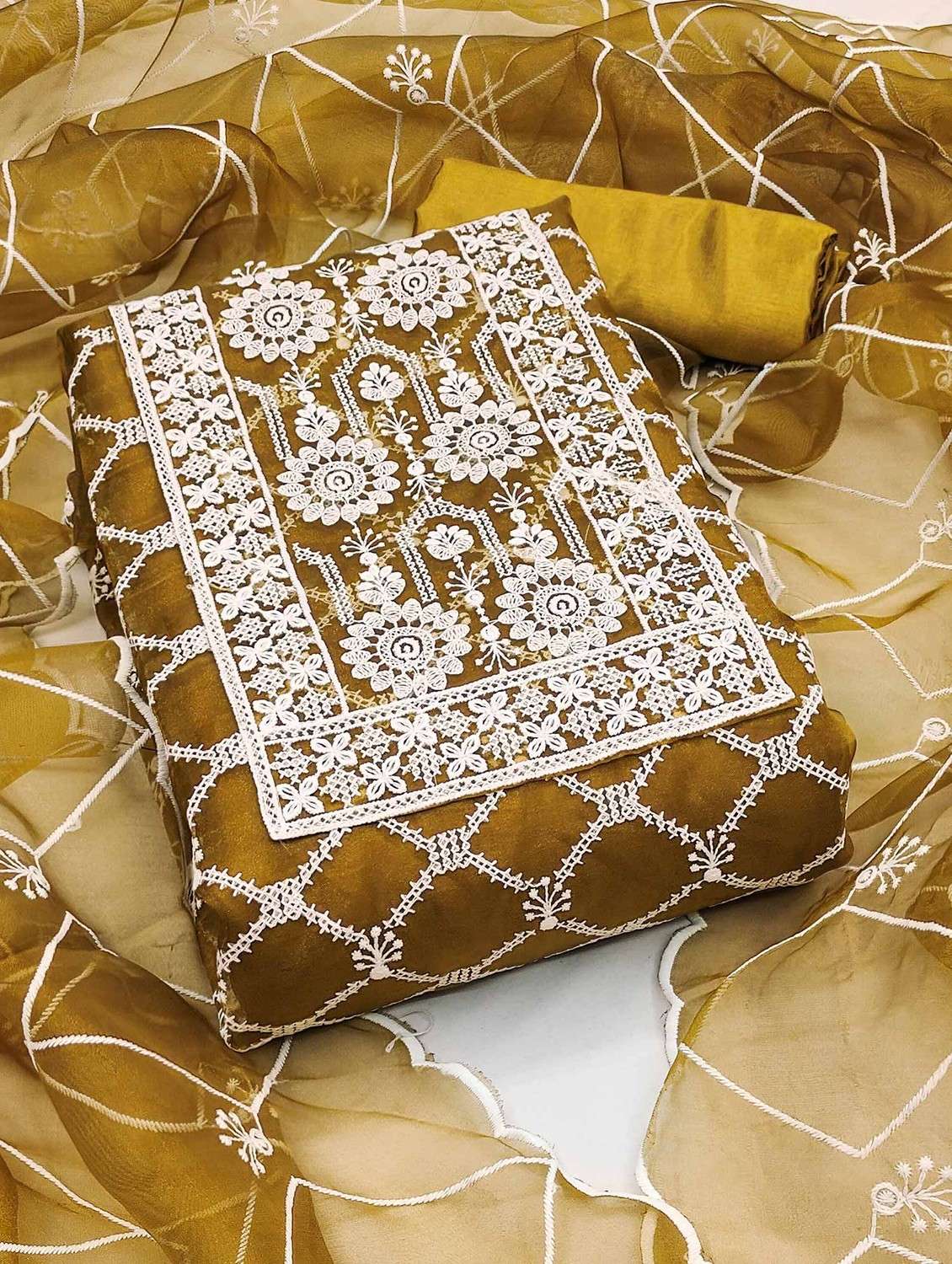 - Look ultra gorgeous in unstitched suits from Peachmode and grab these beautiful suits in mustard colour.