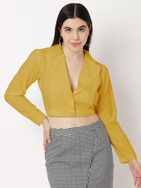 Introducing our Women's Mustard NS Lycra Lapel Neck Blazer Crop Top, a perfect blend of sophistication and contemporary style. Crafted from high-quality Lycra fabric, this crop top features a lapel neck design, creating a chic fusion of blazer elegance and crop top trend. The versatile Mustard color adds a touch of refinement, making it suitable for both formal and fashionable occasions.