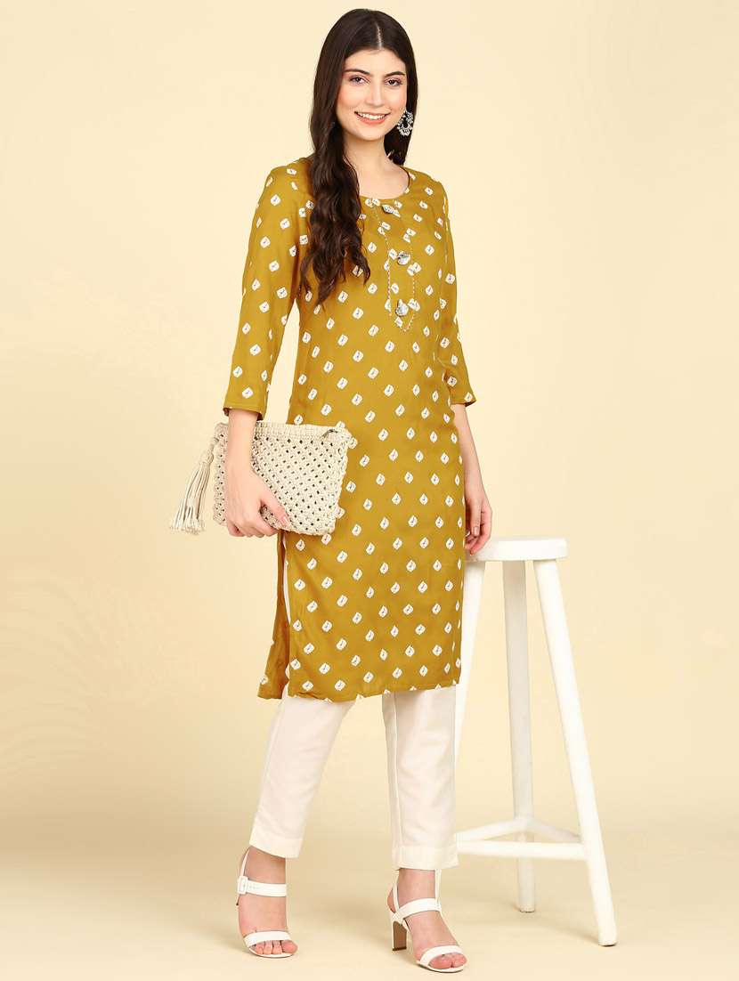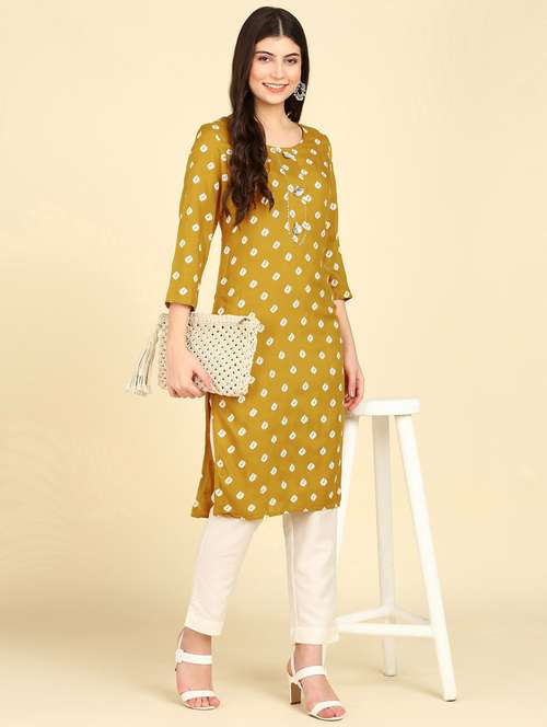 - Grab this beautiful kurta made up of rayon fabric featuring round neck designs.