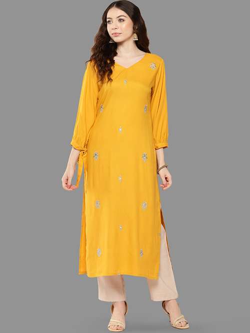 • Grab this beautiful kurta made up of rayon fabric featuring v neck neck designs.