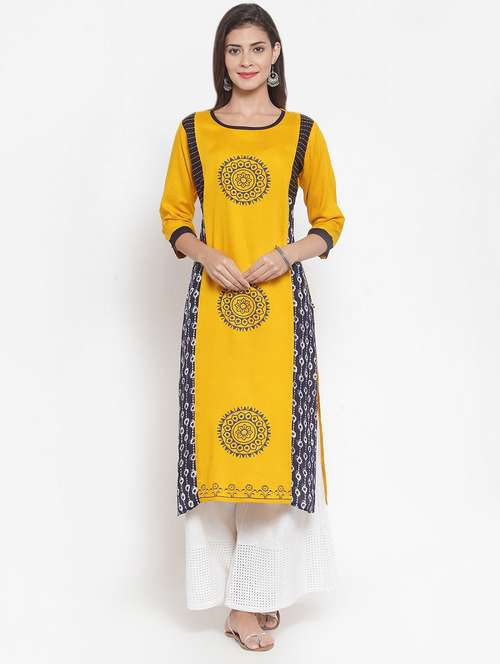 - » yellow round neck printed straight kurta
