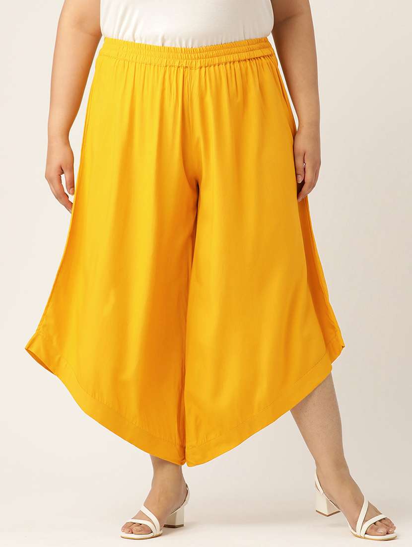 theRebelinme Plus Size Women's Mustard Solid Color High-Rise Relaxed Trouser, has an elasticated waistband with pleated desgin, flat front , angle length and straight hem.