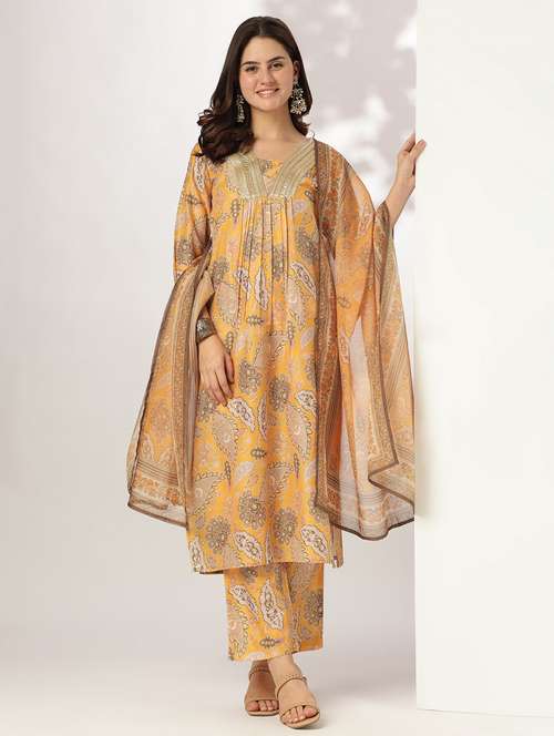 - Find gorgeous sets of ethnic wears in trending designs in mustard colors suitable for festive wear of occasions.