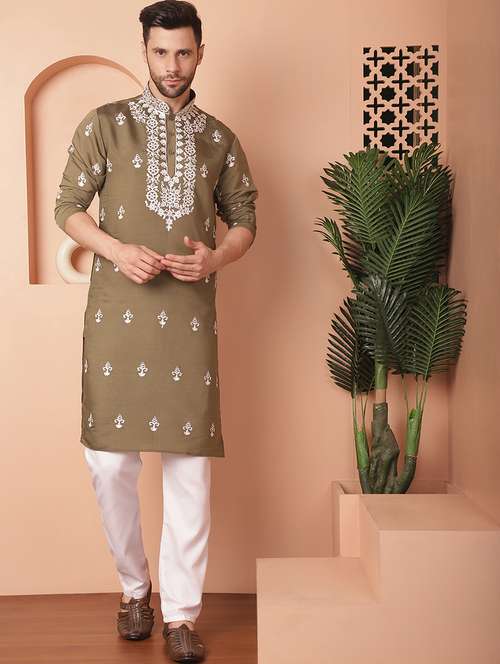 Mustard Floral Embroidered Mandarin collar Long, Regular sleeves Straight shape with regular style Thread work detail Knee length with straight hem Machine weave regular silk Blend
