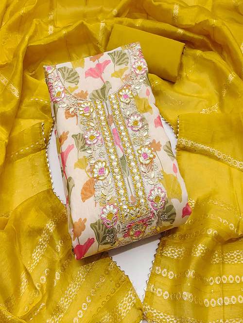 - Look ultra gorgeous in unstitched suits from Peachmode and grab these beautiful suits in mustard colour.