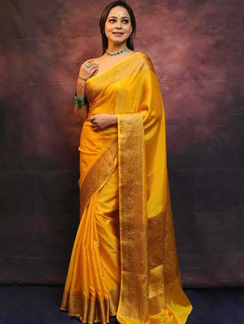 This Mustard saree is crafted from premium lichi Banarasi silk and features intricate weaving work, adding a touch of elegance and charm. It comes with a matching unstitched lichi Banarasi silk blouse piece, allowing you to customize it according to your preferred design and style. Ideal for festive occasions and traditional functions, this saree ensures a graceful and refined look.