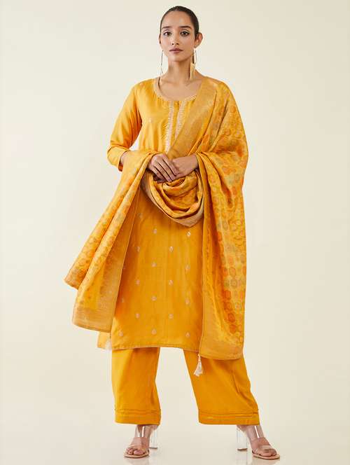 - » mustard self design a-line unstitched suit
