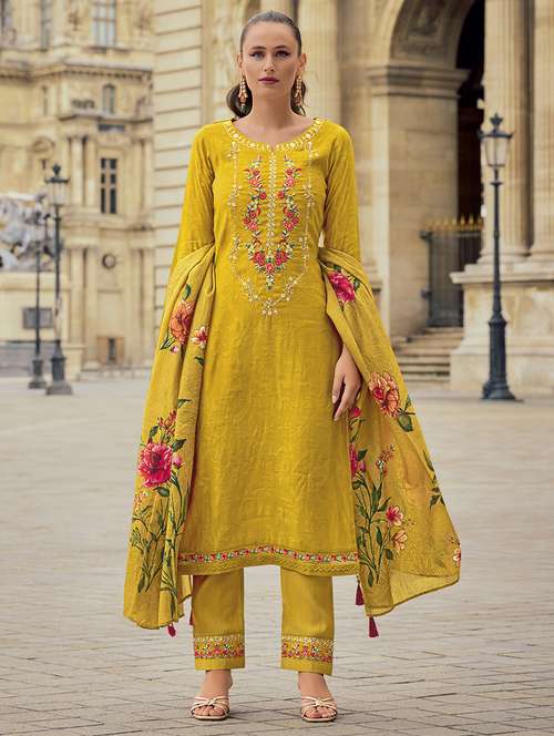 - Find gorgeous sets of ethnic wears in trending designs in mustard colors suitable for festive wear of occasions.