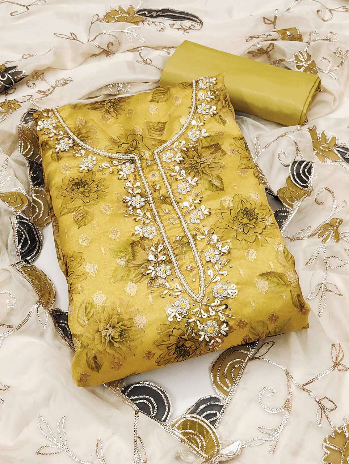 - Look ultra gorgeous in unstitched suits from Peachmode and grab these beautiful suits in mustard colour.