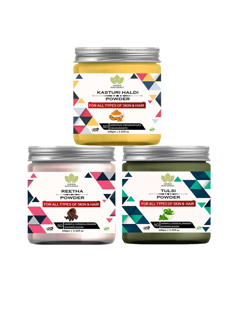 - » 100% pure & naturals kasturi haldi powder 100gm & reetha powder 100gm & tulsi powder 100gm (pack of 3) 300gm