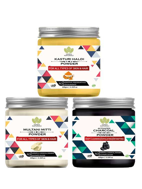 - » 100% pure & naturals kasturi haldi powder 100gm & multani mitti powder 100gm & charcoal powder 100gm (pack of 3) 300gm