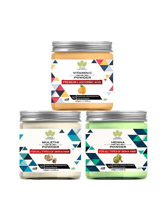 100% pure & naturals vitamin-c powder 100gm & mulethi powder 100gm & henna powder 100gm (pack of 3) 300gm
