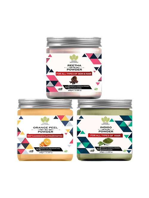 100% pure & naturals reetha powder 100gm & orange peel powder 100gm & indigo powder 100gm (pack of 3) 300gm