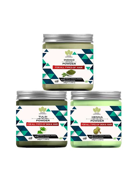 - » 100% pure & naturals indigo powder 100gm & tulsi powder 100gm & henna powder 100gm (pack of 3) 300gm