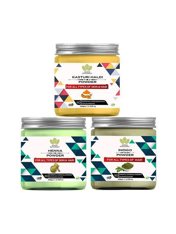 - » 100% pure & naturals kasturi haldi powder 100gm & henna powder 100gm & indigo powder 100gm (pack of 3) 300gm