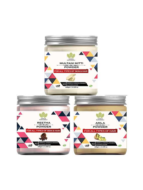 - » 100% pure & naturals multani mitti powder 100gm & reetha powder 100gm & amla powder 100gm (pack of 3) 300gm
