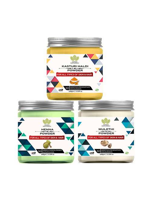 - » 100% pure & naturals kasturi haldi powder 100gm & henna powder 100gm & mulethi powder 100gm (pack of 3) 300gm