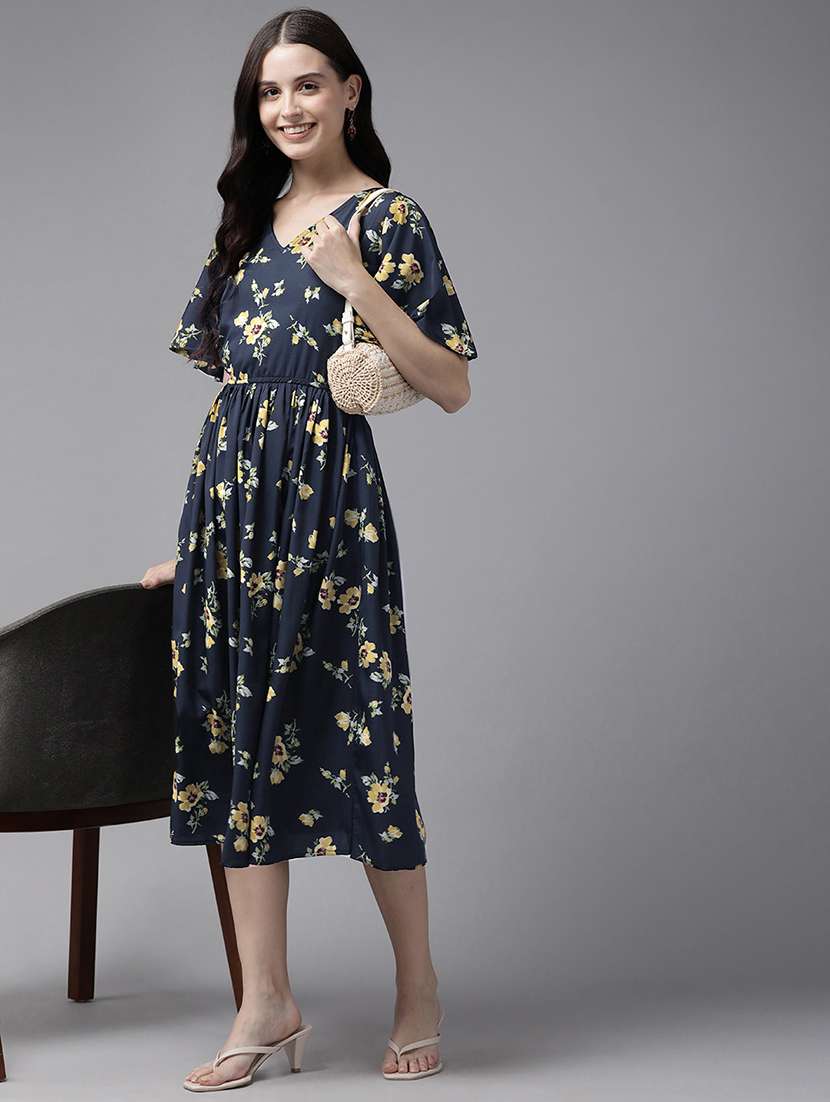 navy blue floral printed fit & flare dress - 21461578 - Very Small Image - 1