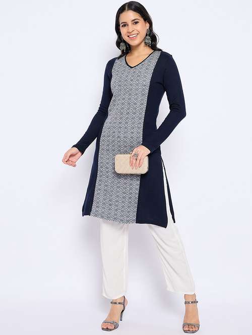- Now, you can look stylish in winters too! Check out the woollen kurtas available at LimeRoad from VIAZAA in navy blue colours.