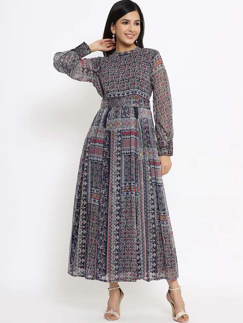- » navy blue printed flared ethnic dress