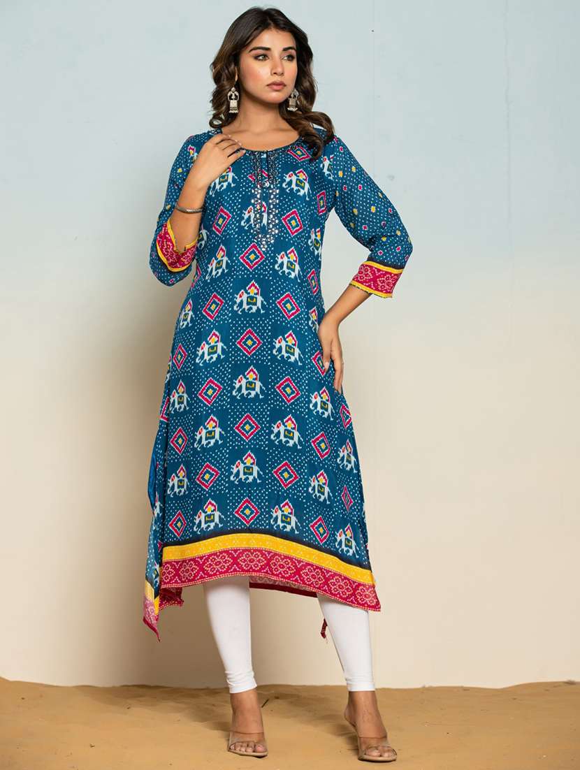 - » women printed three quarter sleeve a-line kurti