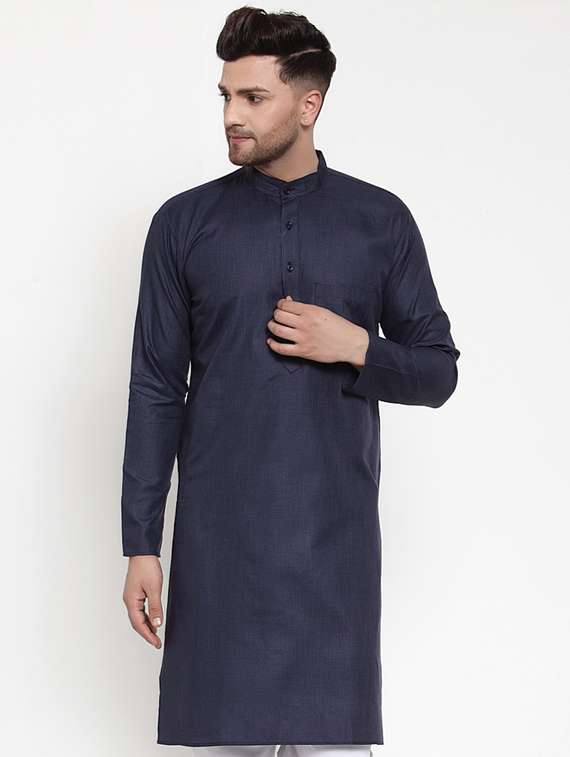 Navy Blue solid straight kurta, has a mandarin collar, long sleeves, straight hem, and side slits.