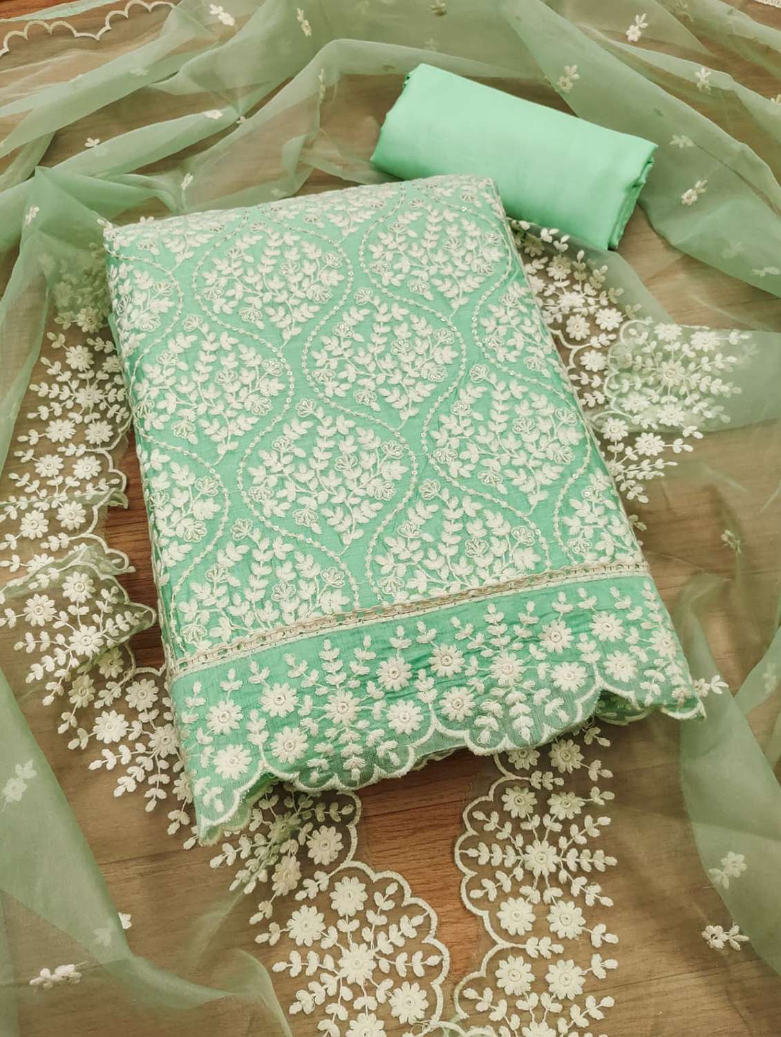 - Look ultra gorgeous in unstitched suits from Leeli Peeri Designer and grab these beautiful suits in green colour.