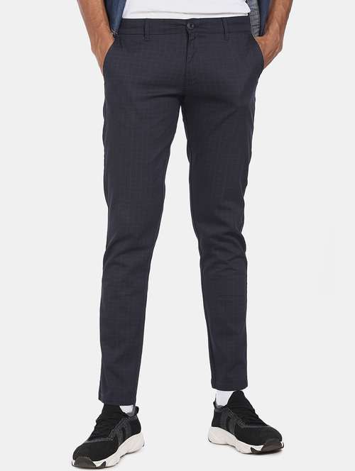 navy blue checkered flat front casual trouser