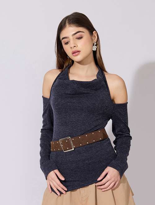 SHOWOFFFF Edition Women's Navy Blue Cold Shoulder Cowl Neck Top with Belt
