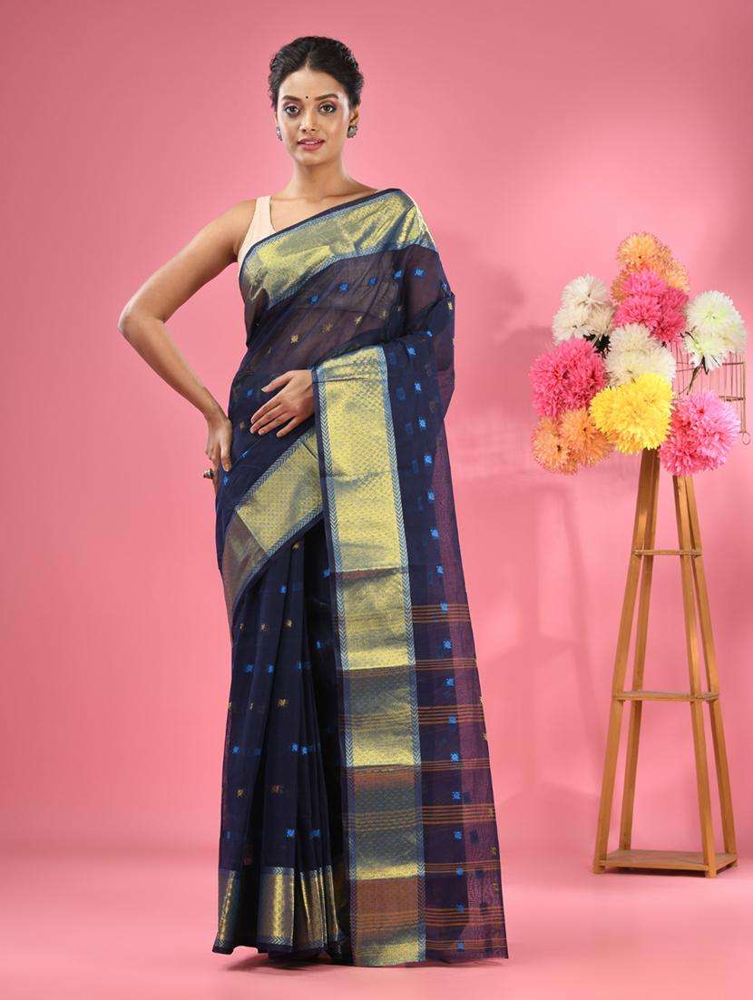 Get a poised and dainty look in this midnight blue pure cotton tant saree. It has woven designs and patterns all over for a beautiful look.
